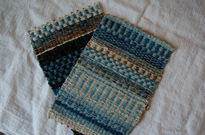 nine books in the works right here. one broken dog tag. not always messy, but always something to think about. on the work table are many partly done ideas, on one loom there is shifu. some ideas may become something this year. some will be ditched, or just not work out. we'll see. i still haven't a word for the year, an intention, but if one comes i will use it.two old pieces, shifu in dyed indigo and black walnut, and natural kozo on cotton warp.